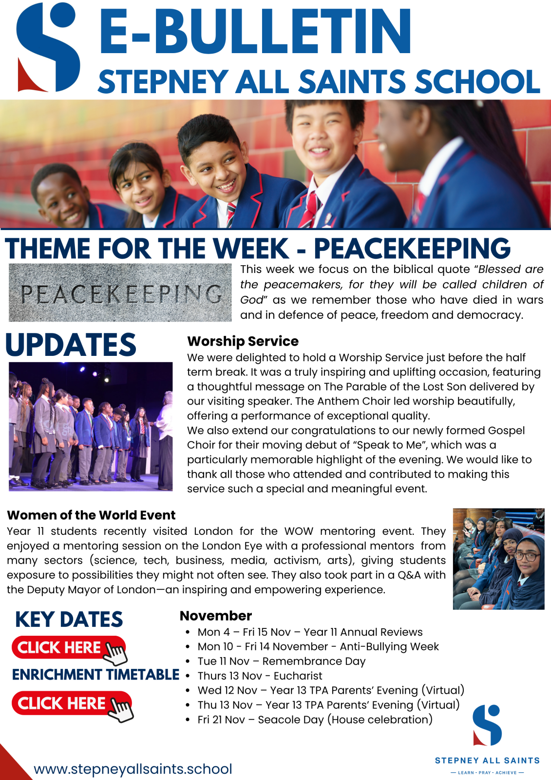 Our weekly Bulletin shares key updates, celebrations, and important notices from across the Stepney All Saints community. It is a quick and easy way for students, families, and staff to stay informed about school news, upcoming events, and the achievements of our young people. It is sent to families via EduLink.